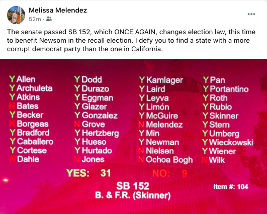 As reported by California Senator Melissa Melendez, “The senate passed SB 152, which ONCE AGAIN, changes election law, this time to benefit Newsom in the recall election. I defy you to find a state with a more corrupt democrat party than the one in California.”