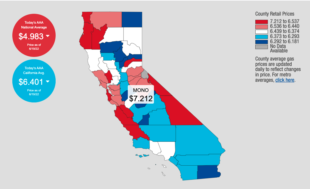 As of Sunday June 19, 2022, AAA reports the Average Gas Price in California is $6.401, while the national average is $4.983. The highest gas price in California is in Mono County at $7.212.