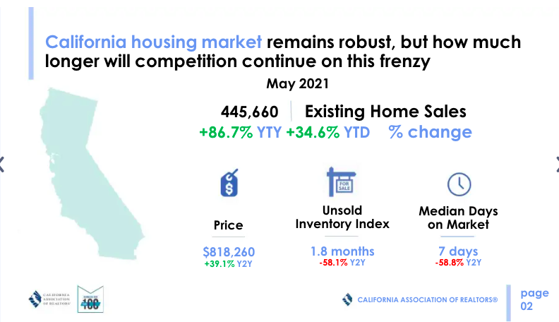 “Heated market conditions and a shortage of homes for sale continued to put upward pressure on home prices in California, driving the state’s median price above the $800,000 benchmark for the first time ever in April, as home sales soared from last year’s pandemic-level lows,” the California Association of Realtors reported.