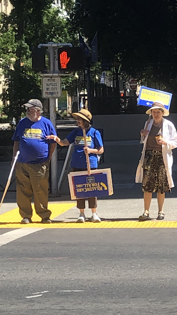 Those with Single Payer signs have no clue that will grind to a halt research, it will make gov't able to stifle procedures and the taxes surely to rise with longer lines with increasing foreigners to come into state and get healthcare for free on their dime and stick around because that is what happens.