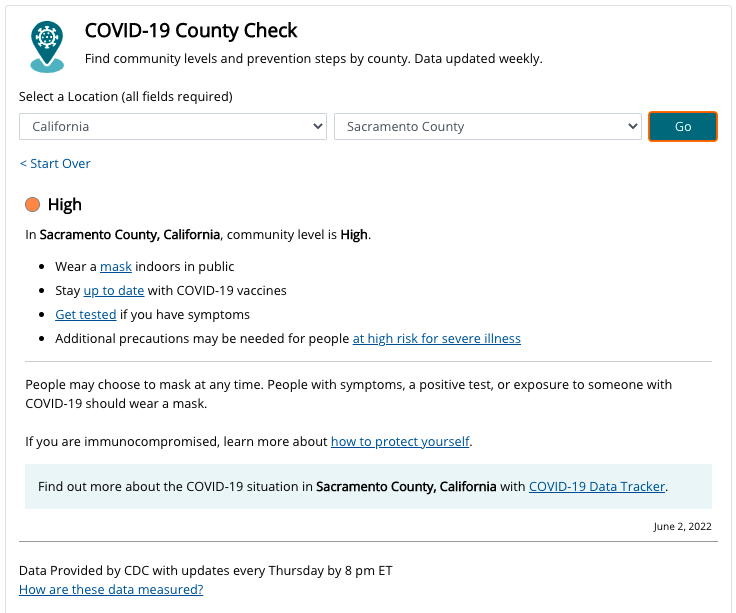 We have been closely monitoring the spread of Covid-19 within our schools and the Sacramento County community to ensure the health and safety of our students and staff. The most recent Centers for Disease Control data released yesterday (5/26) shows the rate of spread in the County is now 8 times greater than it was when we lifted our masking requirement in schools last month, with nearly 300 cases per 100,000 people. As a result, Sacramento County moved from the “low” to “medium” Covid-19 Community Level, as defined by CDC.