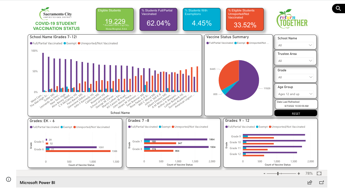 The Sacramento City Unified School District dashboard shows 62.04% of students are fully/partially vaccinated. 33.52% are unreported or not vaccinated. 4.45% of students have exemptions.