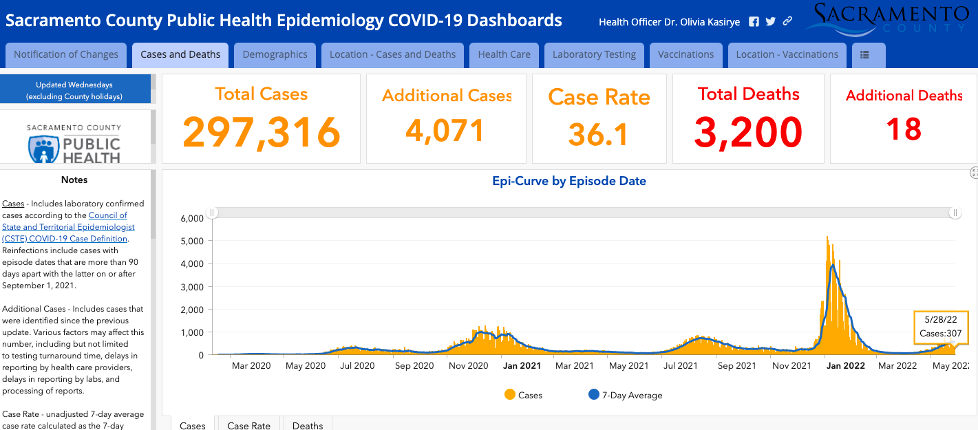 Sacramento County reported 307 “cases” of COVID as of 5/28/2022, 150 are “hospitalized,” and 20 are in the ICU. The 7-day average is 562 new cases. (Why it’s not current with June numbers is a mystery). With the population of Sacramento County at nearly 1.6 million residents, the latest metric feels as if the goal posts were moved. Why is the metric is 300 cases per 100,000 people? The County does not say.
