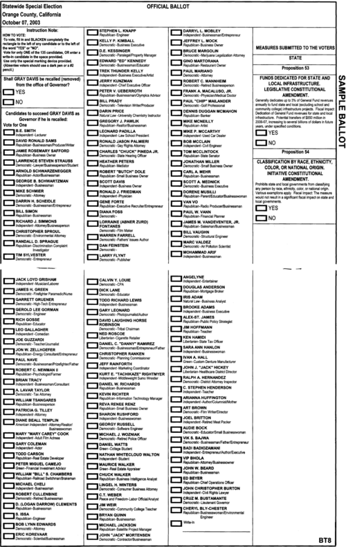 In the 2003 recall of Gov. Gray Davis, 135 candidates ran and the winner received 48.58 percent of the vote, according to Ballotpedia. A sample ballot image of the gigantic 2003 gubernatorial recall election is below.