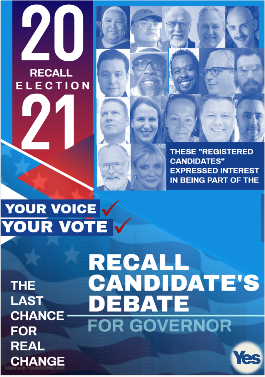 – (MOST IMPORTANT) These debates defeat the main counterpoint to the Recall effort – that only Trump loving Republicans back the Recall – we are hosting multiple Democrats and Green Party candidates and Social Progressives in addition to Mainstream Republicans.
