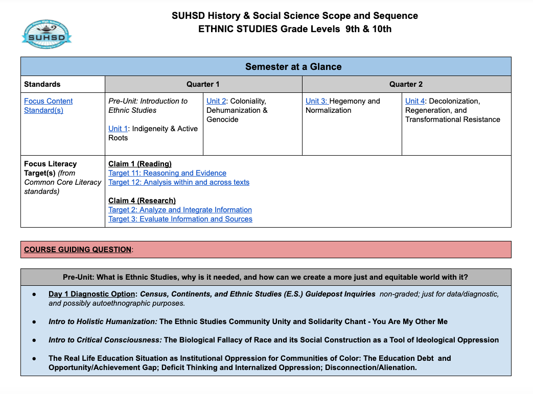 The first page of the SUHSD History & Social Science Scope and Sequence syllabus is just one example: