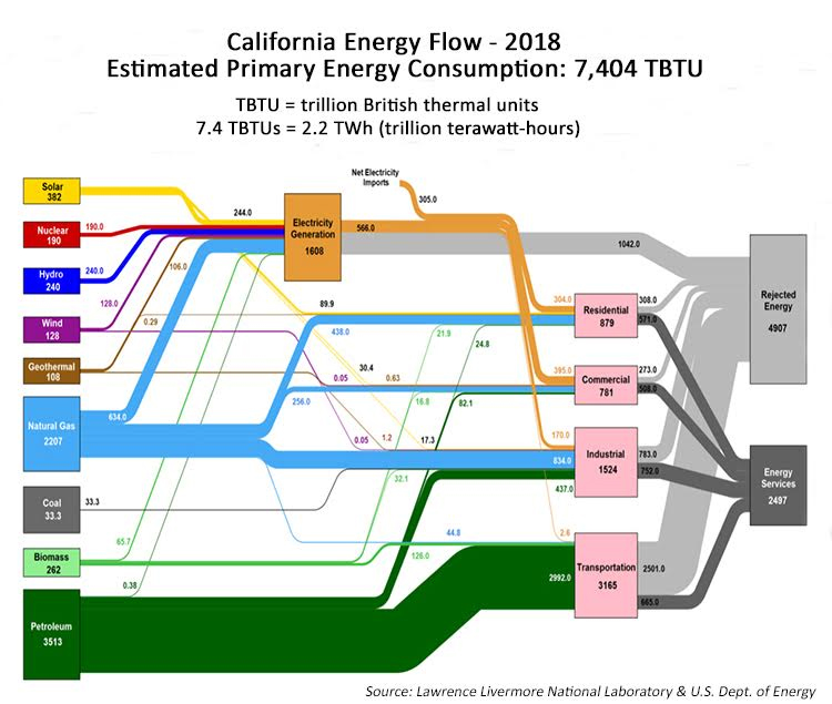 That question will generate as many answers as there are experts to ask, and an attempt will be made to address it in a later chapter. For now, let’s focus on California. Here again, we must overcome scope insensitivity. To do that, let’s establish the denominator: Total energy consumed in California. To get an idea of how complex the process is of getting from raw energy sources—fossil fuels, nuclear, hydro, wind and solar—to actual electrons running appliances or furnaces heating homes, Lawrence Livermore Labs and the U.S. Department of Energy have produced a flow chart that merits close study.